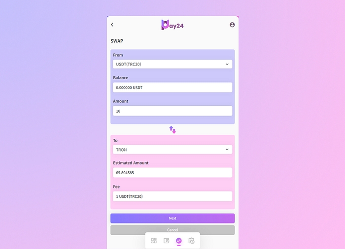 📝To : Other crypto ❗Estinated Amount : Estimated amount of cryptos tobe exchanged relative to users’s crypto ❗Fee : Swap Fee